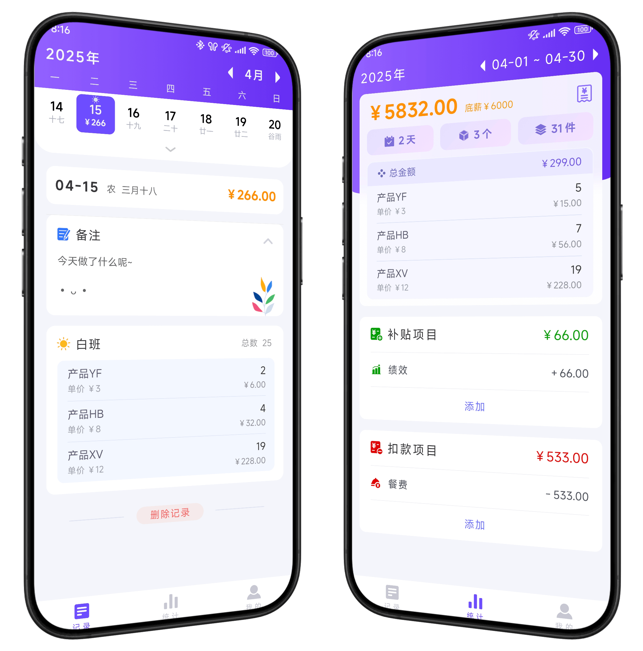 简洁直观的日历视图,精准展示每日工作量与薪资,操作流畅便捷,让数据一目了然